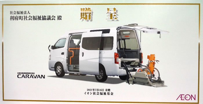 令和3年7月16日、イオン社会福祉基金様より福祉車両1台をご寄贈いただくこととなり、イオンモール新利府南館で贈呈式が開催されました。当日は、施設の皆様へと記念品も多数いただきました。