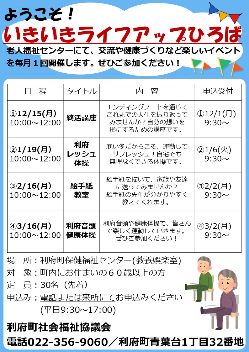 場 所:利府町保健福祉センター(教養娯楽室) 対 象:町内にお住まいの60歳以上の方 定 員:毎回各30名(先着) 申込み:電話または来所にてお申込みください (平日9:30~17:00) 利府町社会福祉協議会 電話022-356-9060/利府町青葉台1丁目32番地